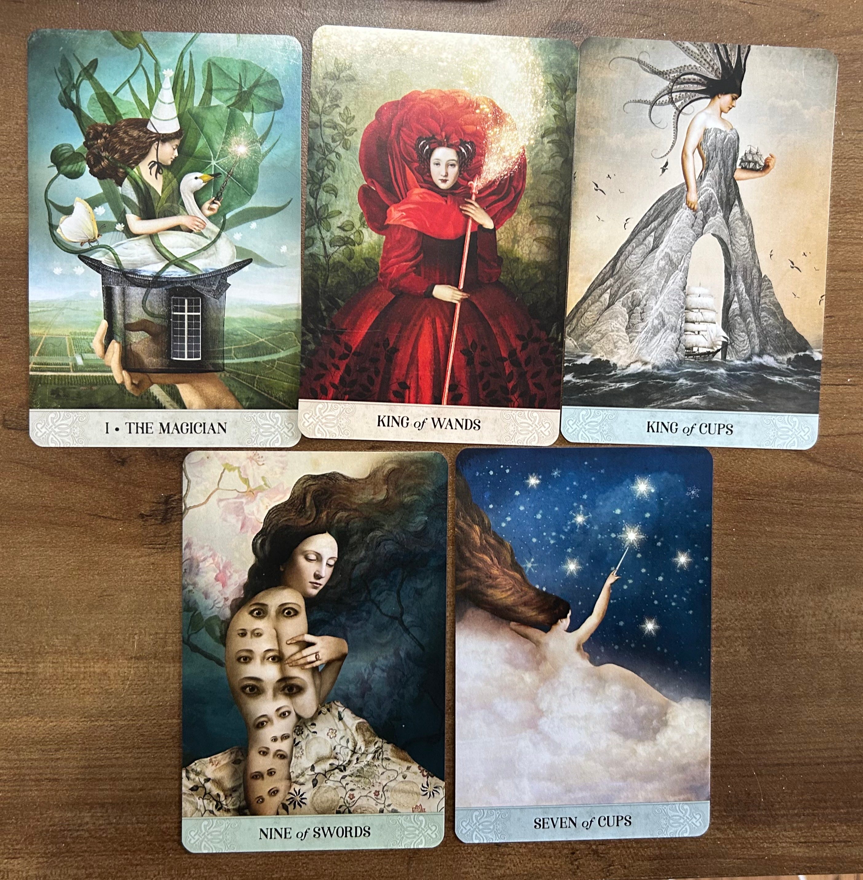 The top three cards are for the phases of life. I drew magician for youth (magic), king of wands (rational mind) for middle age, and king of cups (emotional, intuition, and self-trust) for old age.